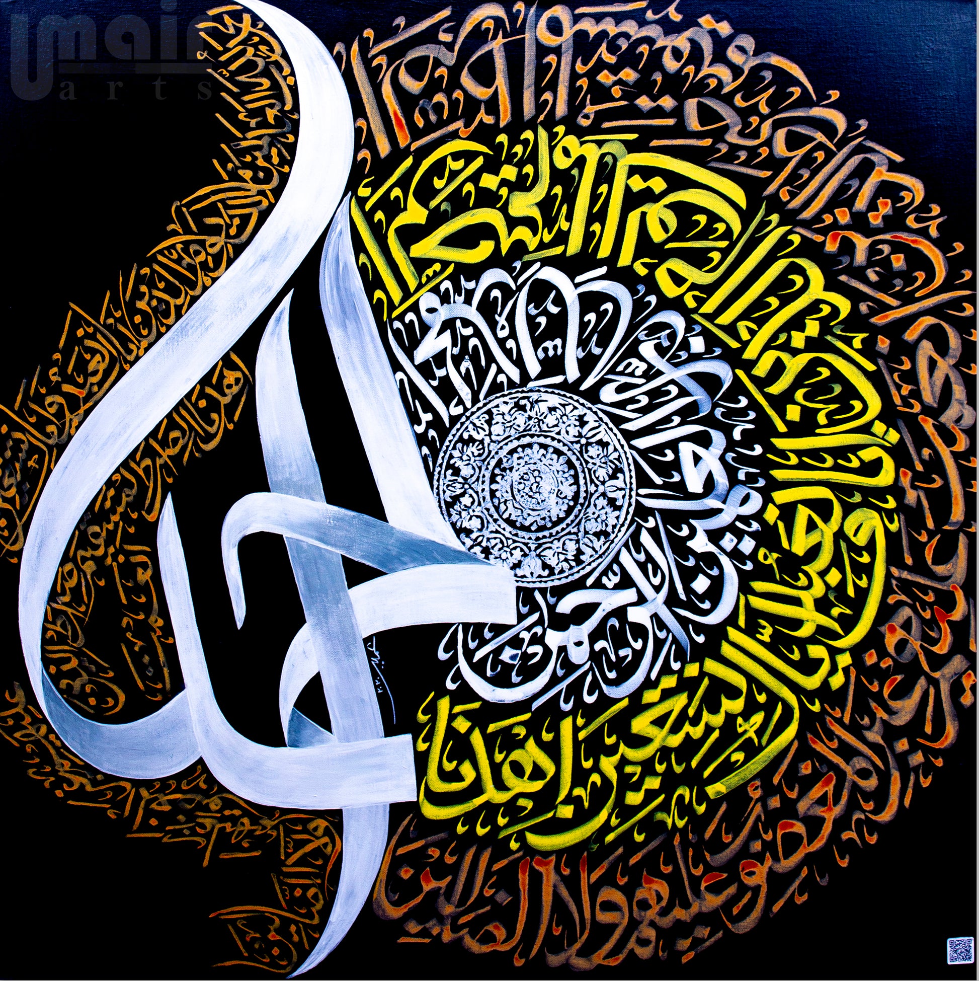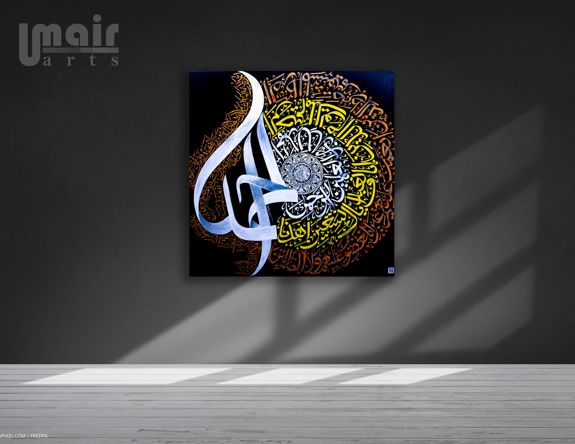 A beautiful, modern, and stylish handmade Islamic calligraphic painting on canvas in acrylics. It’s a continuity of my unique artwork of writing complete surahs of the Quran. The colors used in this painting are very decent and refreshing. It is one of my most-liked artworks on social media. This masterpiece will refresh your home as well as your heart.