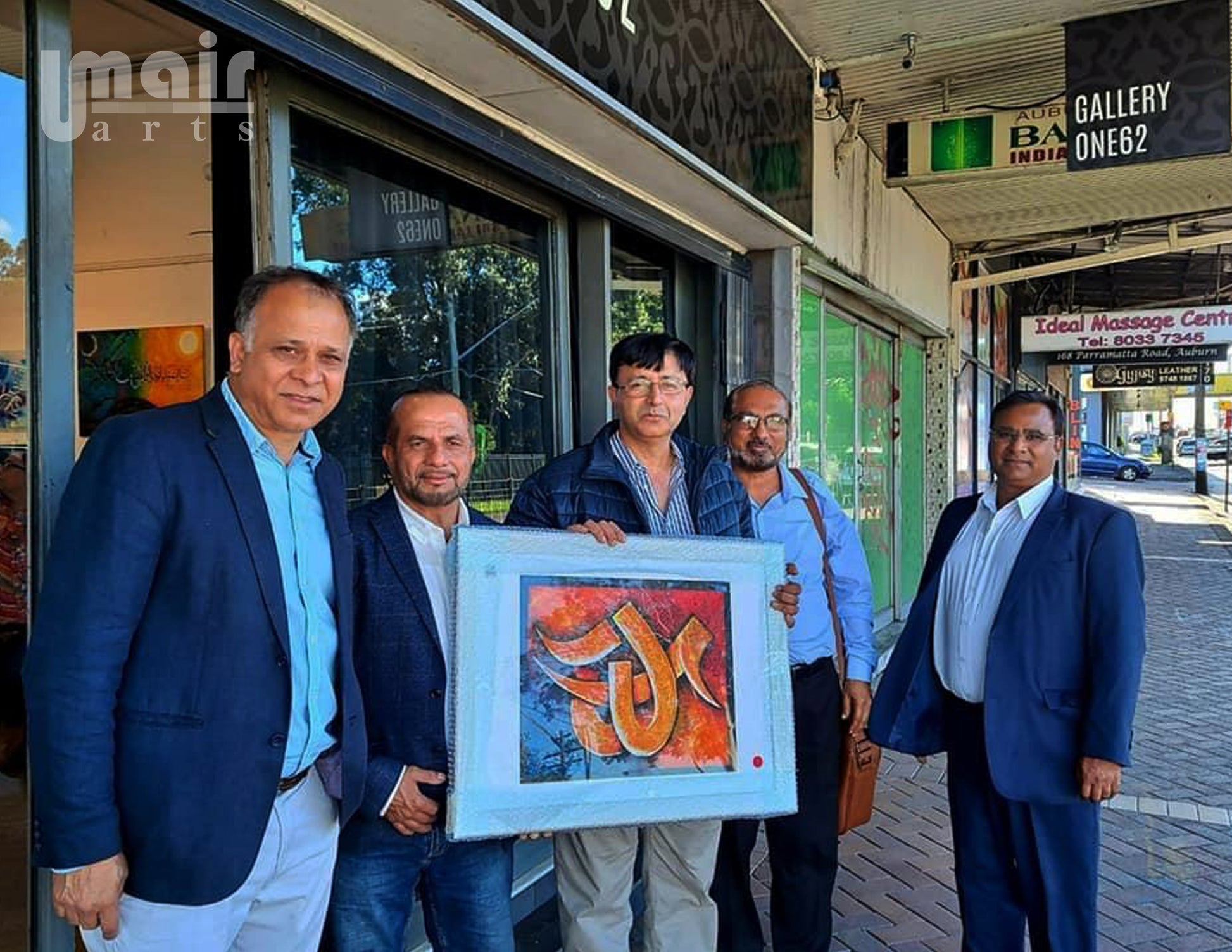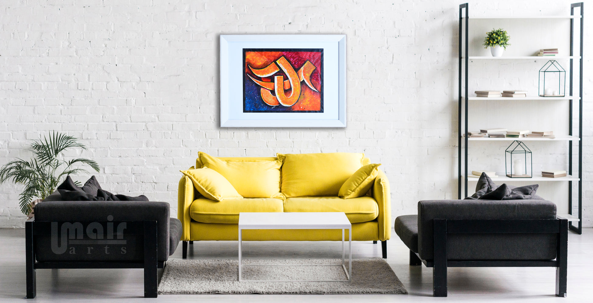 This is a handmade painting on canvas in acrylics. Islamic calligraphy with a colorful background. It is beautifully framed and would look good on any wall. The original has all the textures.