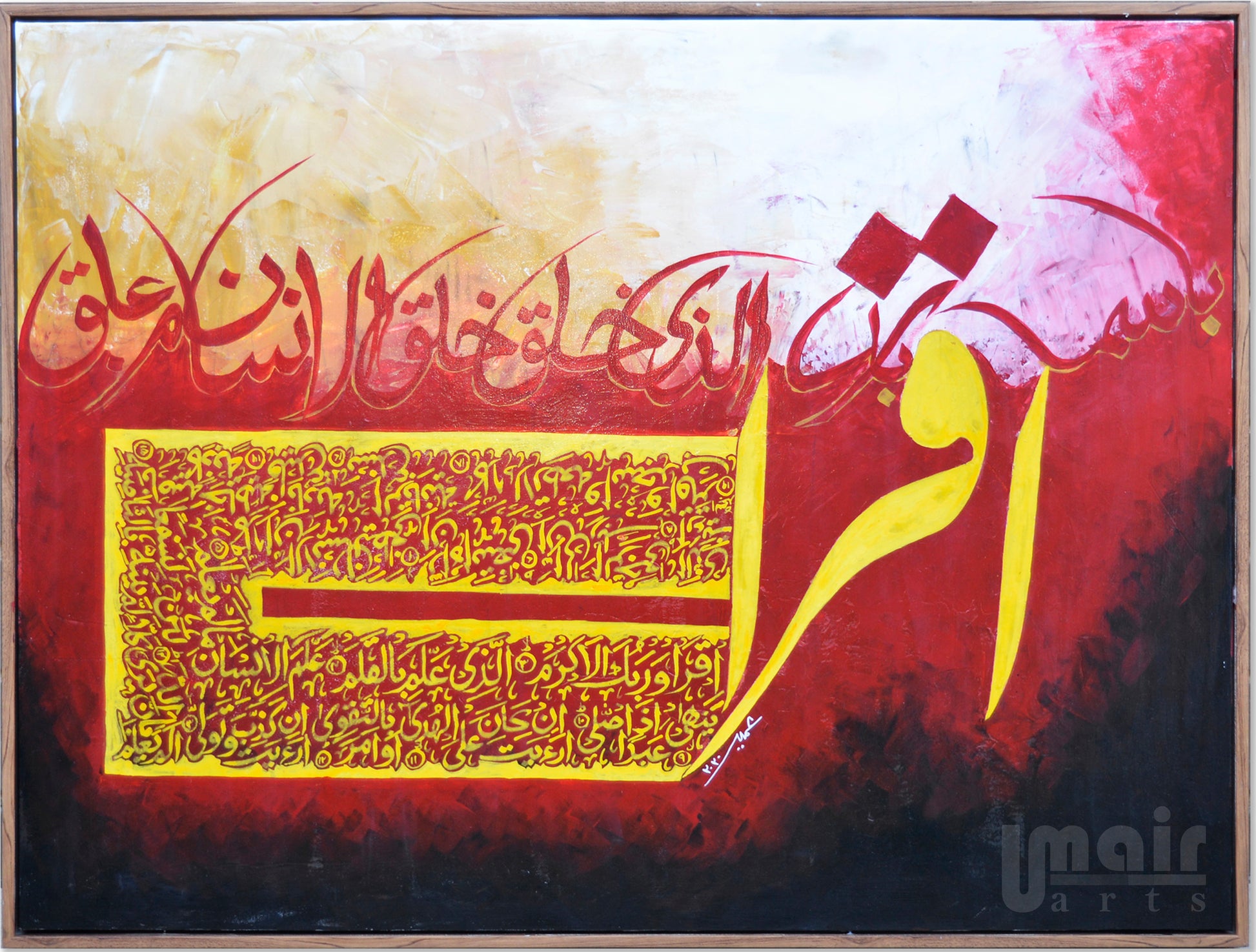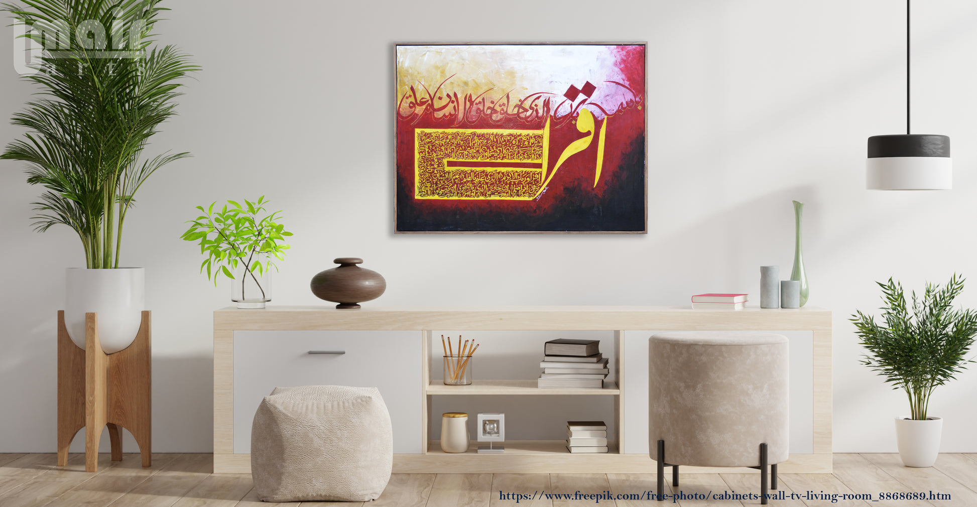 A stylish and handmade Islamic painting on canvas in acrylic medium. This elegant Islamic calligraphy in a floater frame will refresh your home as well as your heart.