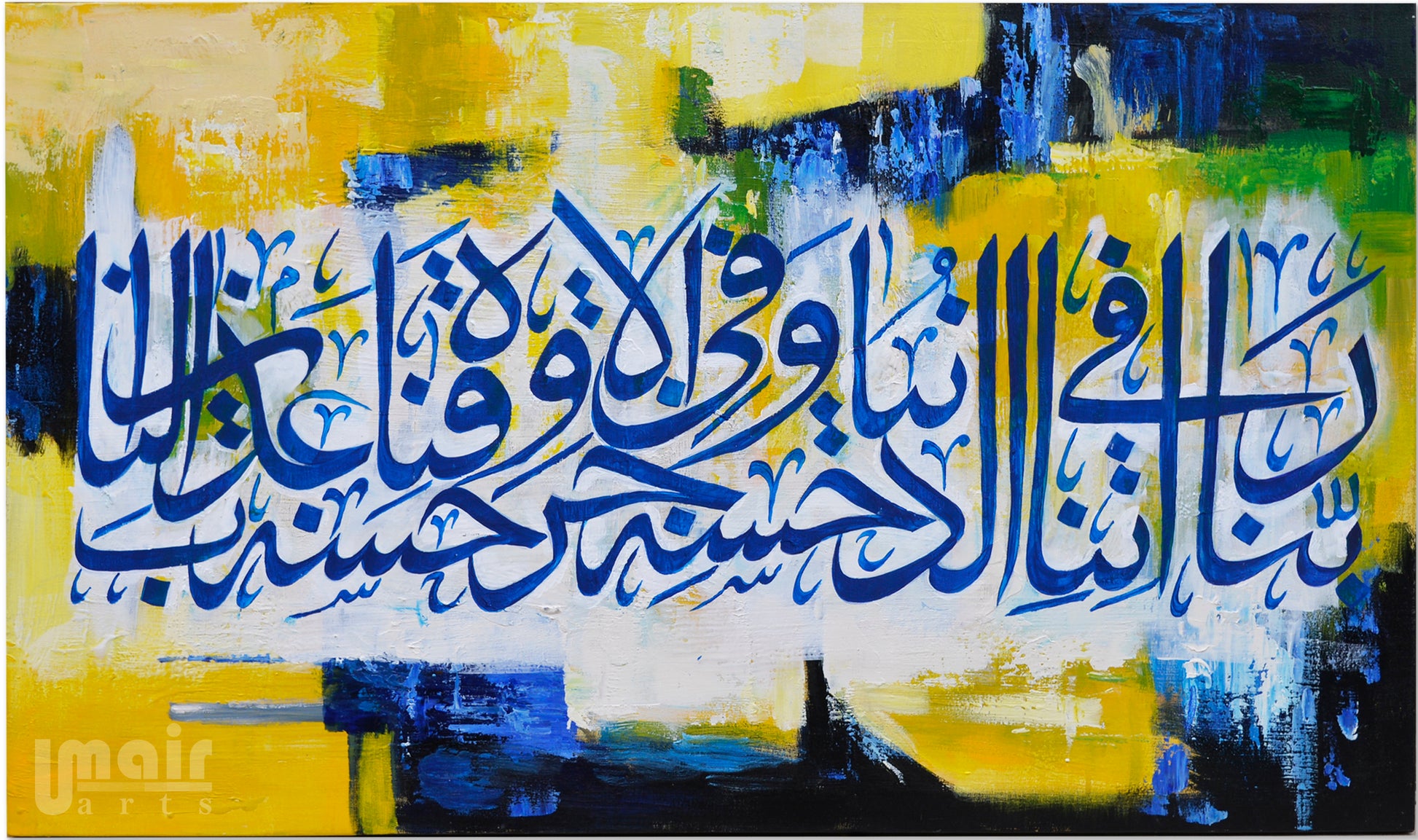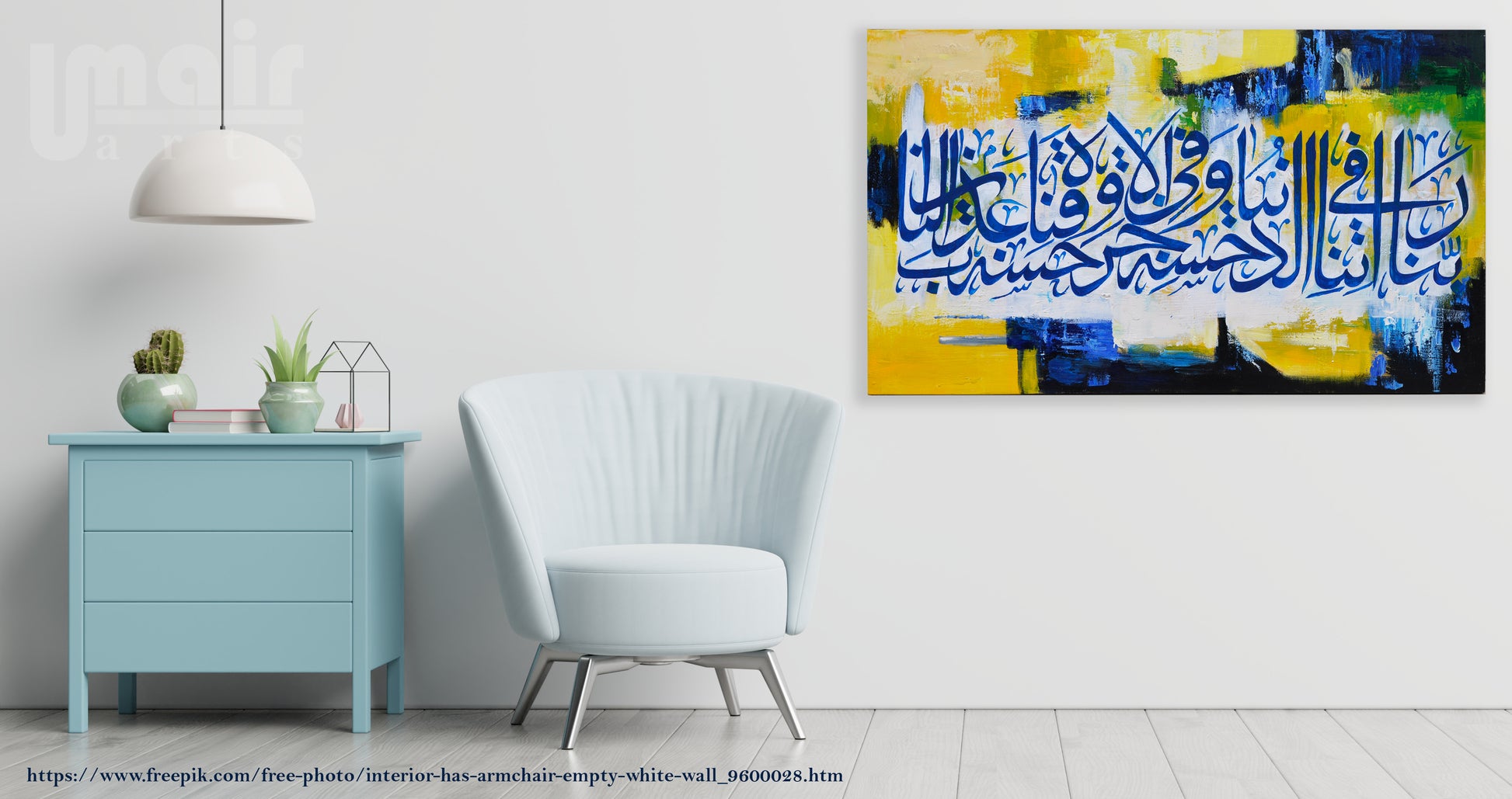 A stylish and handmade Islamic painting on canvas in acrylic medium. This beautiful Islamic calligraphy will refresh your home as well as your heart.
