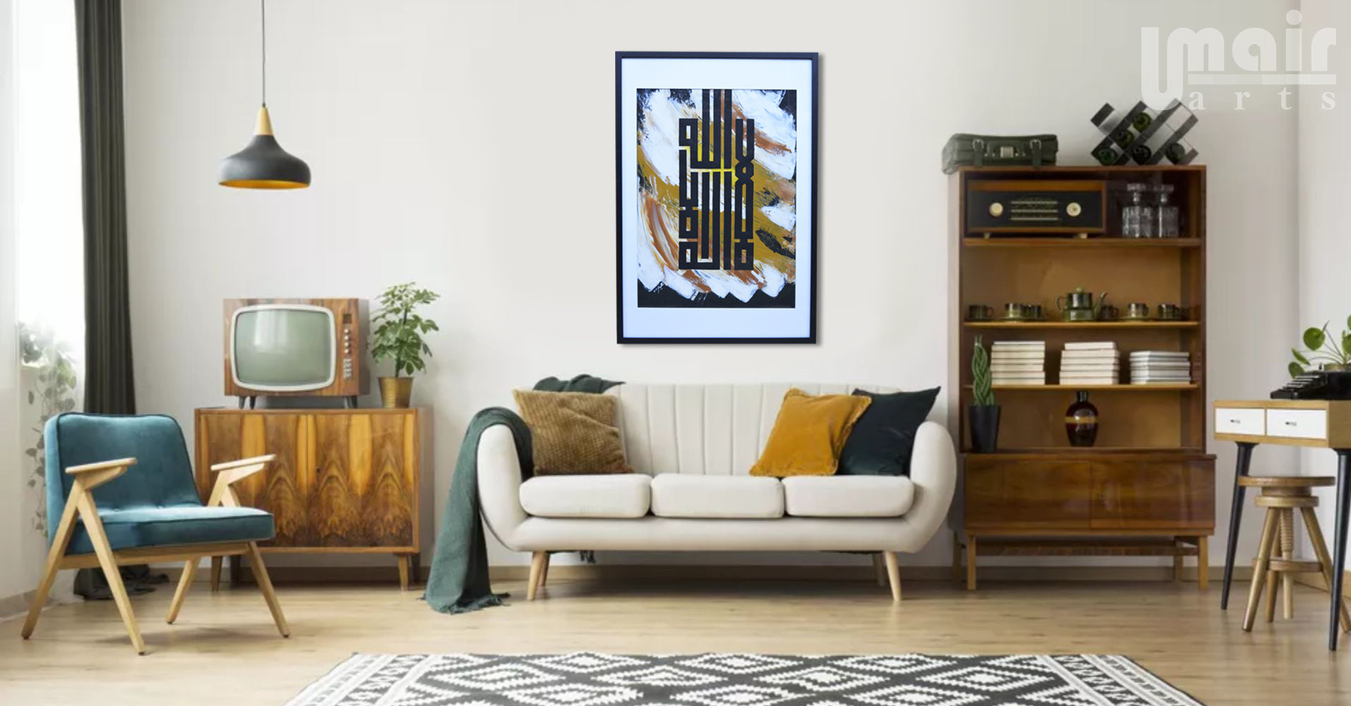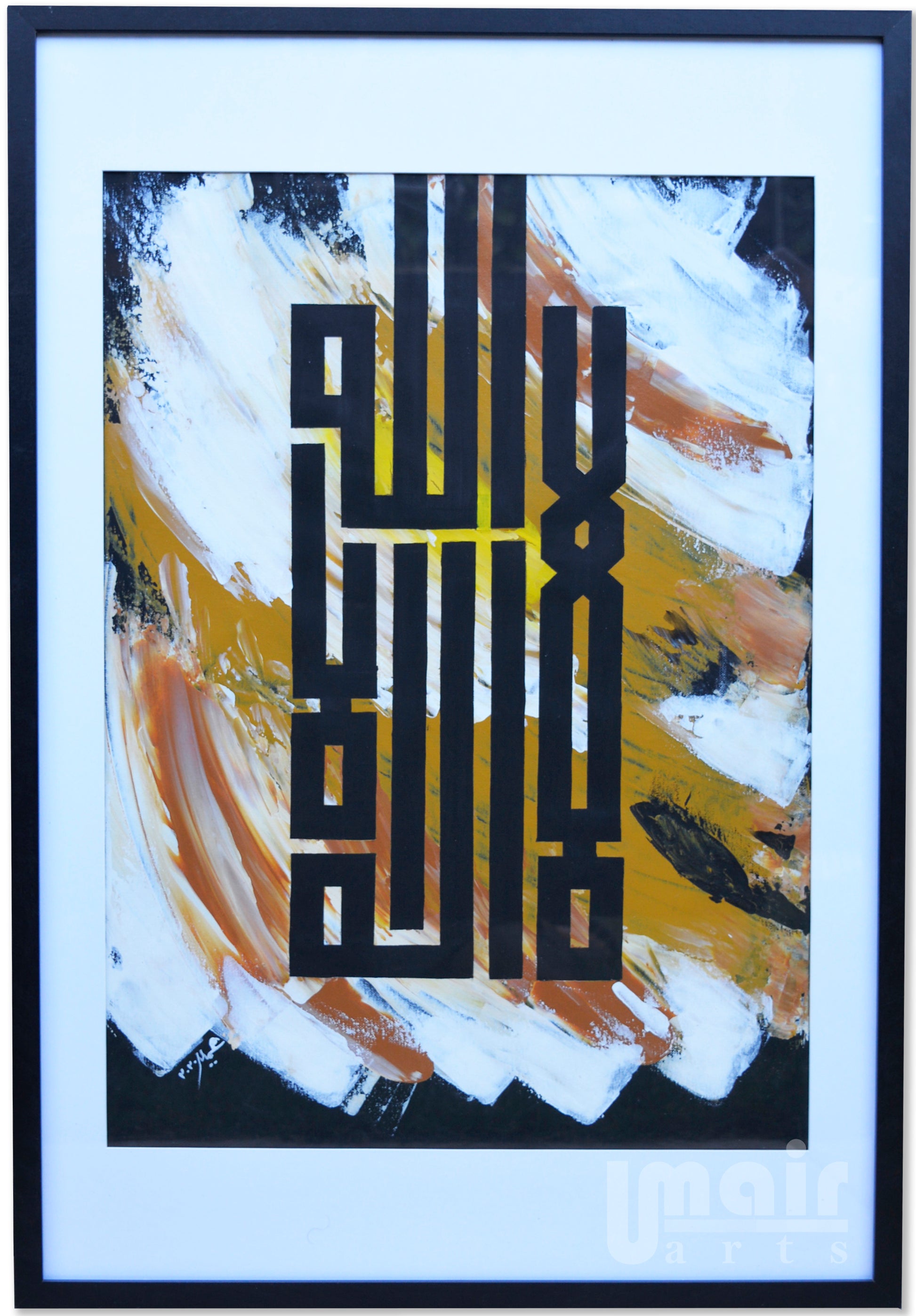 A stylish and decent handmade Islamic painting on canvas in acrylics. Islamic calligraphy with square Kufic traditional style in eye-catching colors. It is framed and will refresh your home as well as your heart.