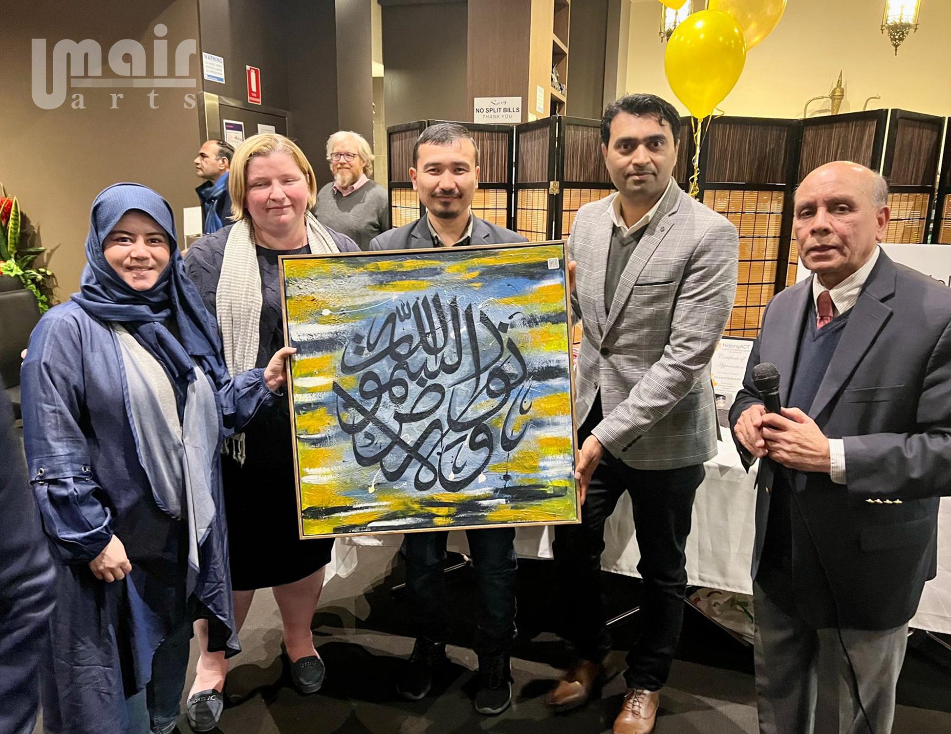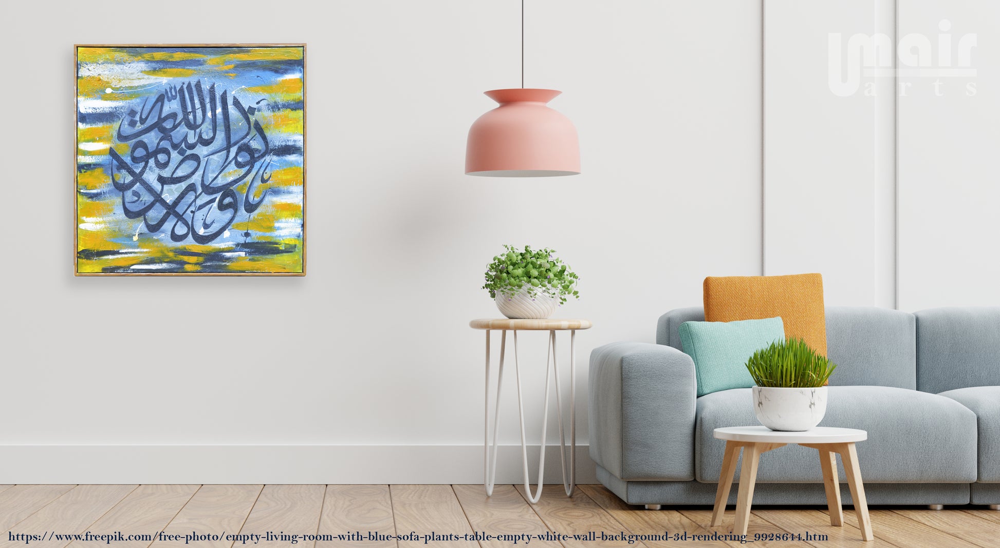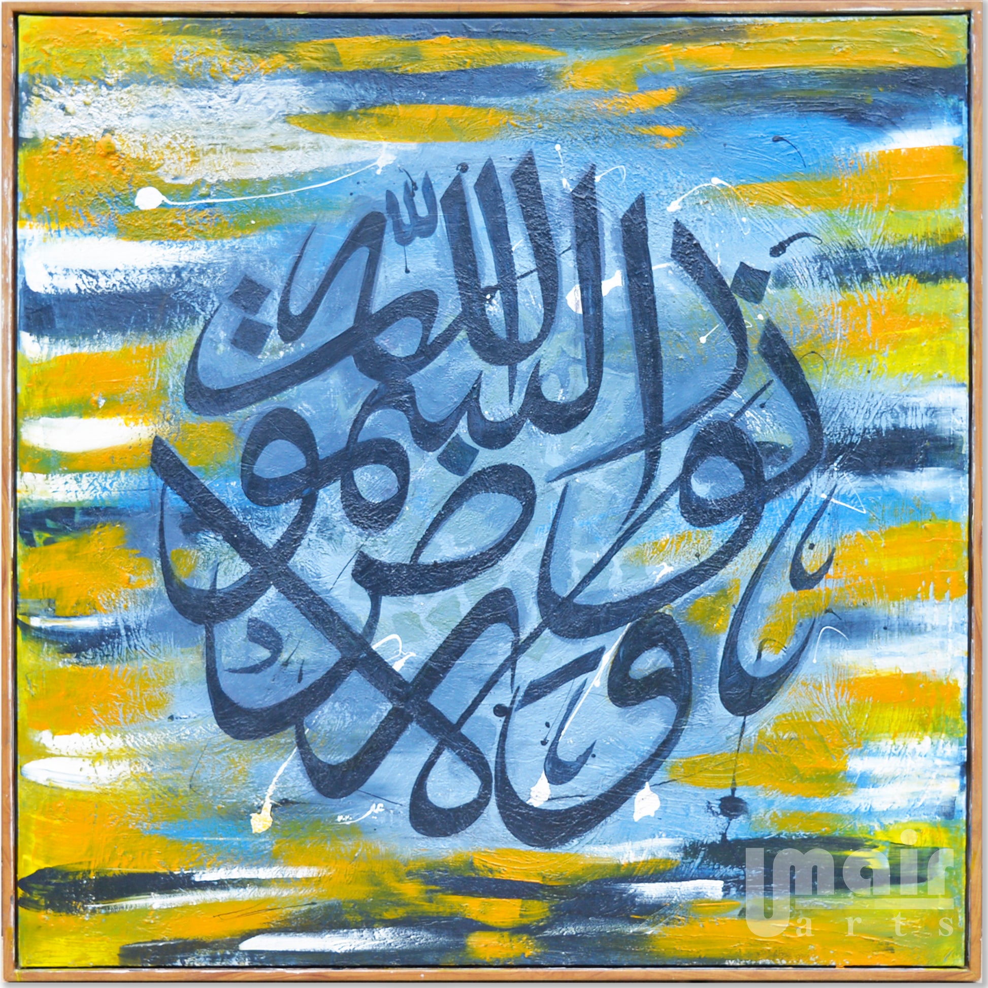 This is a handmade painting on canvas in acrylics. Islamic calligraphy in a beautifully textured background. It is floated framed and would look good on any wall. The original has all the textures.