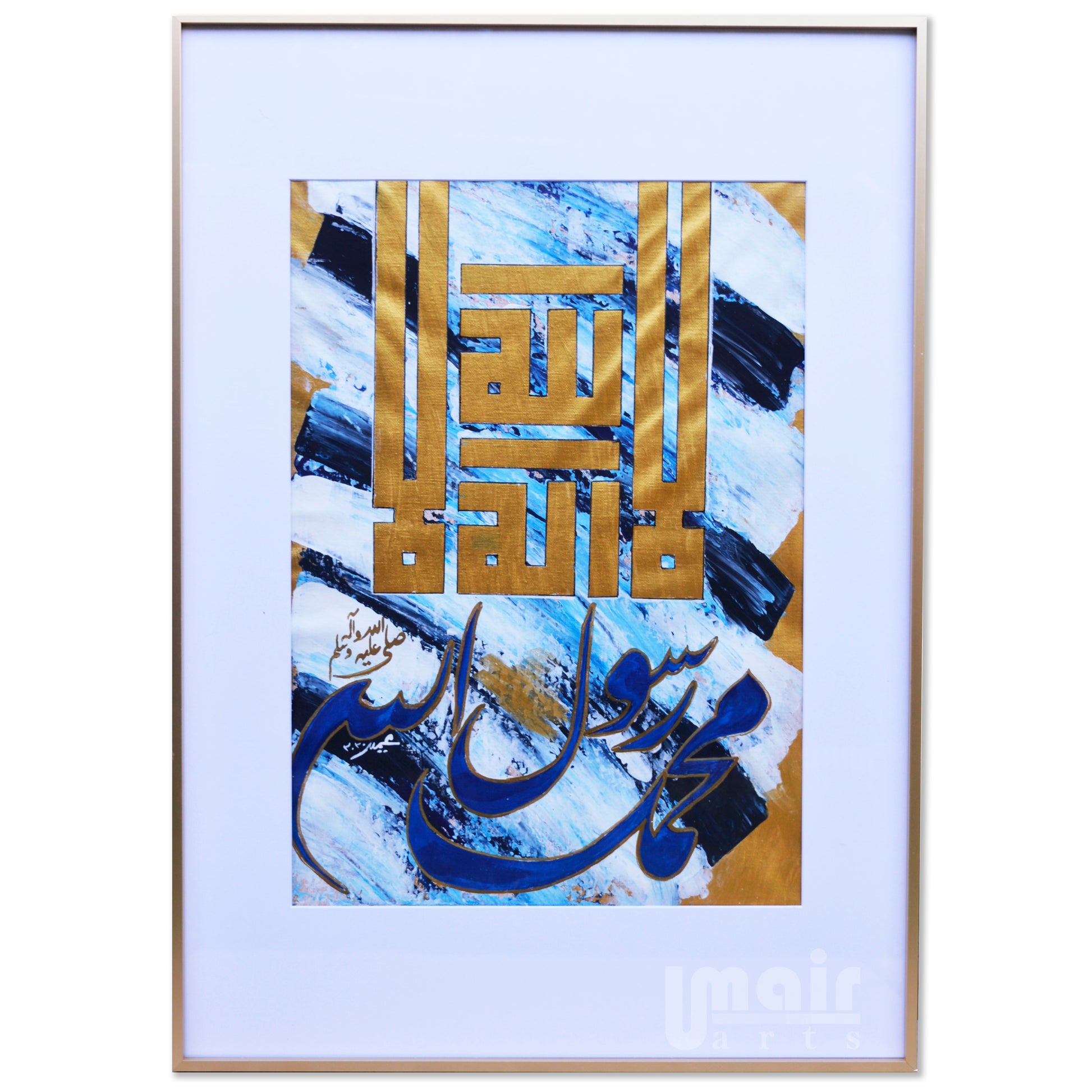 This is a handmade painting on canvas in acrylics. Islamic calligraphy with a textured, abstract background. It is beautifully framed in a golden aluminum frame and would look good on any wall. The original has all the textures.